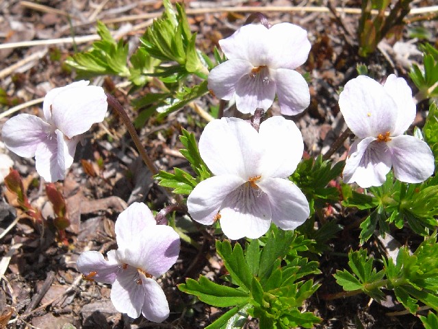 ★葉が裂けているスミレは以下の4種類が検索で見つかった・エイザンスミレ(Viola eizanensis/叡山菫):葉が基部より3裂。淡紅色の花をつけるが,白色もある。日本固有種。 ・ヒゴスミレ(Viola chaerophylloides/肥後菫):葉が基部より5裂 ・ナンザンスミレ(Viola chaerophylloides/南山菫):朝鮮半島や中国大陸に分布、ヒゴスミレの母種 ・トリアシスミレ(Viola pedataビオラ・ペダタ/鳥足菫):葉が細かく裂けて鳥の足の様子。分布アメリカ(マサセーチューセッツ、ミネソタ、フロリダ) 情報源: ○群馬大 ○植物図鑑 ○野生植物写真館 |