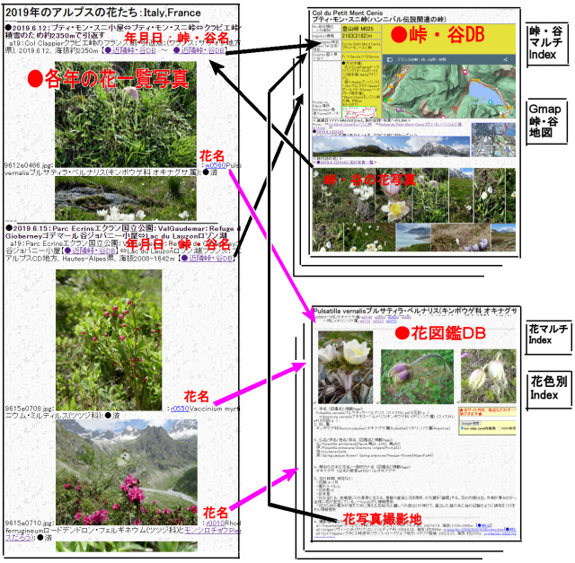 ◆花図鑑DB、峠DB、紀行記事の関連を右に図示します。