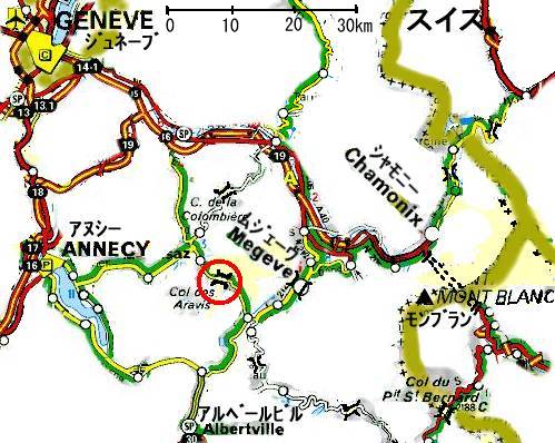 ![]() 【峠の位置:図左:フランス南東部、イタリア国境に近いアルプスエリア/図中:モンブラン、シャモニーから西に約30km、ジュネーブから約50km南東にある山岳地帯/図右:主要道路ではない峠道、右(東)にモンブランとシャモニー】【●Google地図】 |