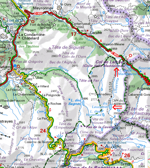 ・Fourane -Valフォラーヌ渓谷(●045-3渓谷)参照 ・Larcheから車で細い道を川沿いに走り駐車場に。 ・Larche峠の西に車を置いて、歩いて約1kmで駐車場に来る事ができる(お勧め)。 ・le VallonのP(1907m)からLac-du-Lauzanierロザニエ湖(2284m)まで歩く(登り約1.5h)。 |