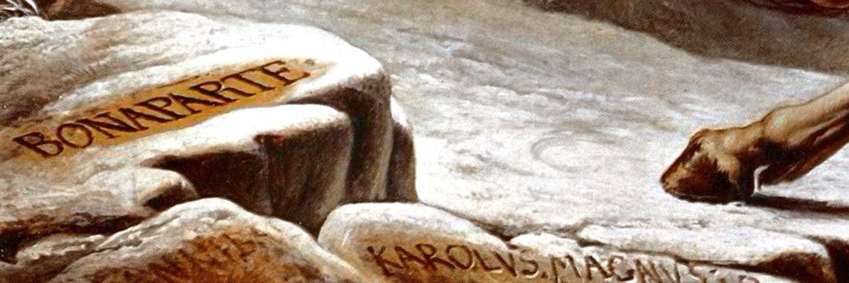 ![]() 【ナポレオンのアルプス越え:左・David, Jacques-Louis作】【右:David, Jacques-Louis作の肖像画の足元:クリックで拡大】 『ナポレオンのアルプス越え』(David, Jacques-Louis作)の足元には、 左BONAPARTE:ボナパルト、下HANNIBAL:ハンニバル(BC247/246-BC183)、右KAROLUS MAGNUS:カール大帝=フランク王国シャルルマーニュ(742-814)・・この3人がアルプスを越え他国に攻め入った英雄だと・・書き記させた。 |