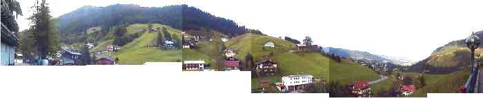 【谷を越えた東側から村の中心方面を見る。左に教会が、真ん中に泊まったHOTEL Happy Austriaが、右がオーバストドルフ方面】