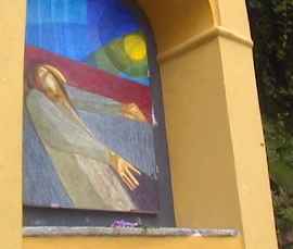 横浜の若野さんから、以下の情報をいただきました。ありがとうございます。 ●Gradinata del Calvario「ゴルゴタの丘への道」 「Gradinata」=「装飾された階段」・・・キリストが十字架を背負って歩いた、ゴルゴタの丘への道を表しているのだそうです。 「Calvario」=ラテン語のカルバリアから、イタリア語のカルバリオになったのだと思いますが、エルサレムのゴルゴタのことです。キリストが磔になった所です。 我々カトリック信者は「十字架の道行き」と言っていますが、あの絵も、その苦難を記念するためのもので、14枚あったと思います。キリストが死刑を宣告され 墓に葬られるまでが描かれていたと思います。 ザルツブルグやハルシュタットでも同じ様なものを見かけましたが、こち らはリアルな彫刻でした。カトリック教会の聖堂には必ずこの「十字架の道行き」 が、キリストの受難を思い起こさせるために描かれているか、壁に小さなレリーフ の様に飾られています。 あの絵を描いた人物が分かると良いですね。かなり現代的に描いていますので あまり知られていない画家かも知れません。もしかすると、巨匠かも!? −−− 当初「Gradinala」とHPに記述しましたが、「Gradinata」の間違いでした。若野さんの友人=イエズス会のスペイン人神父さん(P.I.さん)=が見つけて指摘していただきました。ありがとうございます。 ヨーロッパ・アルプスの峠にめどがついたら、是非ピレネーの峠や、スペイン、グラナダ、アルハンブラにも行ってみたいと思います。(2001.3.25) |