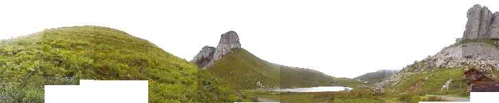 【岩に沿って行くと、ツインの石の塔が合流する場所Lac de Mayenマヤン湖に出ます。ここは1842mなので約200m下ったことになります。牛小屋に住人が来るのは暗くなってでしょうか?雪渓も溶け小さな池になっています。Tour de Mayenツール・ド・マヤン(2327m)の方は霧の中です。】