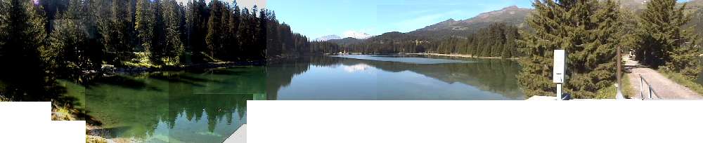 【Heidseeハイデ湖(Igl Lai)1485mがこのリゾートの中心にあります。ここから川は南に流れ、アルブラ川と合流、ライン川に流れていきます。そしてここの峠は、ドイツ語とロマンシュ語の境でもあるそうです。湖の中州の道からの眺めです・・・鏡のように写る山の影・・・深い緑と濃い青空・透き通った水・・・透明な湖の中に、小さな魚も・・・素晴らしいですね。】 ・・0a3.jpg