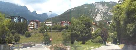 【ドロマイトの石でしょう。この岩からの成分がこの湖の色を作っているのでしょう。日光浴の何組もの家族が、芝生を彩っています。そして谷の間から、ブレンタのドロミテの高い岩山が見えます。夏も冬も、そして当然春秋も、この明るい保養地は旅人を癒してくれます】