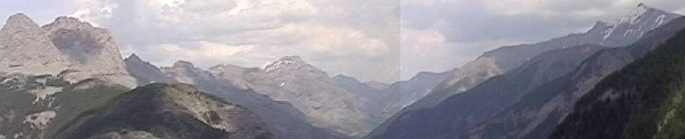 こちら側が西・南:いま来たアロスの村の方向。流れる水は、ヴェルドン川→デュランス川→ローヌ川に。右上の山はTete de Vescal251mでスキーリフトが見えますね。その左に隠れそうな山がGrde Seolane2909m、さらに左・谷の向こうがLes Trois Evechesトワゼビシェ2819m】