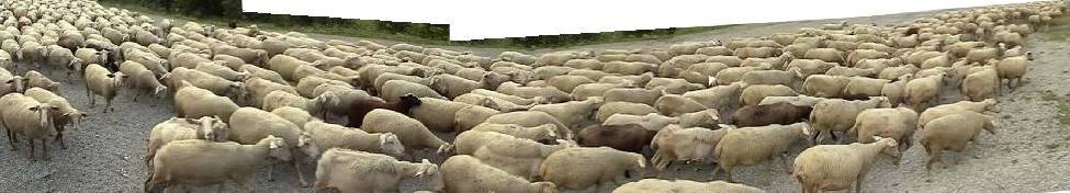 モン・ヴィーゾ(モンテ・ヴィーゾ)山M.Visoの北の寒村。夕刻、牧羊犬が数百頭の羊を、搾乳のために羊小屋に引き連れて行きます。その群れの正面にあった、1mほどの高みからの撮影。 |