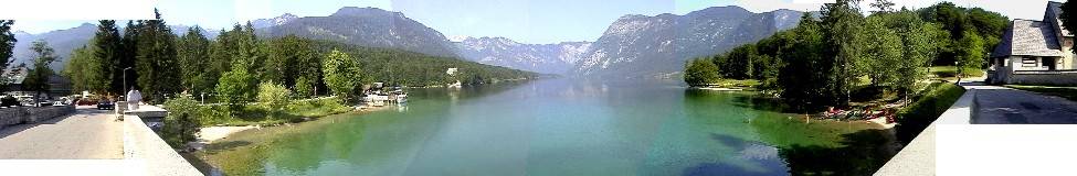湖の最も東、橋の上から見るボヒニ湖です。少し風が出てきたのか水面の鏡ははっきりしませんが、エメラルドグリーンの美しさは格段です。左の山の稜線の先に白い山が見えていますが、Kuk山(2086m)などのKomna山脈の大・分水嶺の山でしょう。トリグラフ(トリグラウ)山は、右(北)の方にあるはずですが、見つけられません。