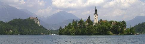 【504.jpg:一周したブレッド湖・・島に聖マリア教会と、遠方ブレッド城】