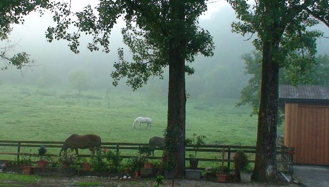 早朝の窓から見る霧の牧場、数頭の草を食べる馬、真っ白な一頭はペット的な家族の一員でしょうか。納屋のほうから歩いてきたのは、多分ここのおじいさんおばあさん、落ち葉などを燃やしながら紅茶のようなものを飲んでいます。牧歌的なオーバエスタライヒ(上オーストリー)州の朝です。