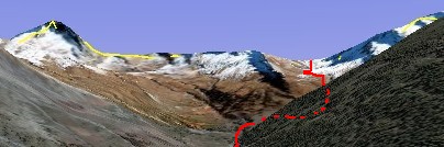 【ハンニバルがマロール峠を越えたとすると、上の赤いルート(トレッキングルートだが、イタリア側はかなりの難易度らしい)を進んだと思われます。しかしこの峠のイタリア側はかなりの急斜面、トラヴェルセッテ峠の傾斜にも匹敵する場所でしょう。もし、このルートを初冬の悪天候の中、無理をして通過したと仮定し、多くの兵や騎馬の被害があったとしたら・・・ それを知った後続の象や食料などの大量の荷役は、推測するに・・偵察隊を出し・・下のUrine峠のルート(安易なコースで、現在GR58Bのトレッキングのメインルートになっている)を取るだろう思うのです】 |