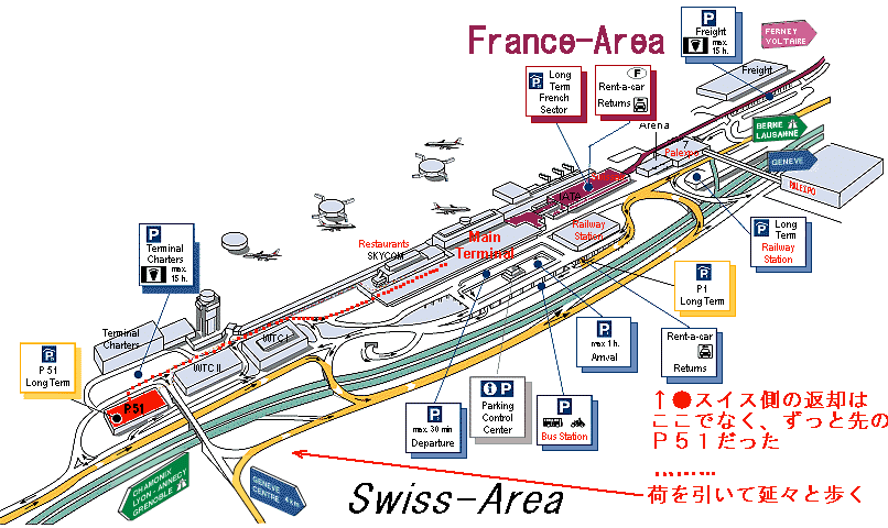 ![]() 【Map1:ジュネーブは周りをフランスに囲まれている。アヌシー方面に行くのには苦労する】 ![]() 【Map2:ジュネーブ空港にはフランスエリアが引き込まれている】 ![]() 【Map3:ジュネーブ空港のフランスエリアには、Air-Franceカウンター、レンタカーなどがあり、スイス側から通関経由でつながっている】 |