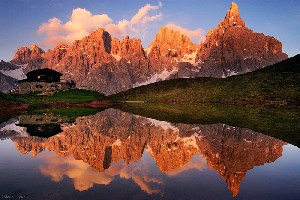 ●Dolomiti Enrosadira ドロミテ エンロサディラ・・・Enrosadira=アルペングロー=ピンクになること=赤い岩イタリア・ドロミテ各地で見られ、日没や早朝に岩山が赤(バラ色)に輝く現象。岩石にドロミア(石灰岩にマグネシウムが混ざったもの)が含まれているため光を反射する。
