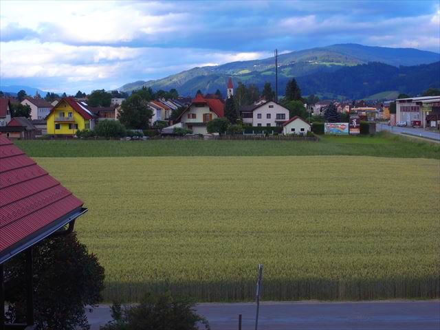 【宿の天窓から北方向に、村の中心と教会が見える】